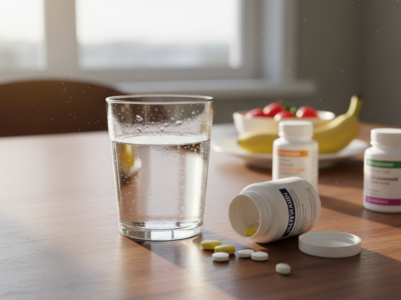 아침 식탁 위에 놓인 보충제와 물 한 잔