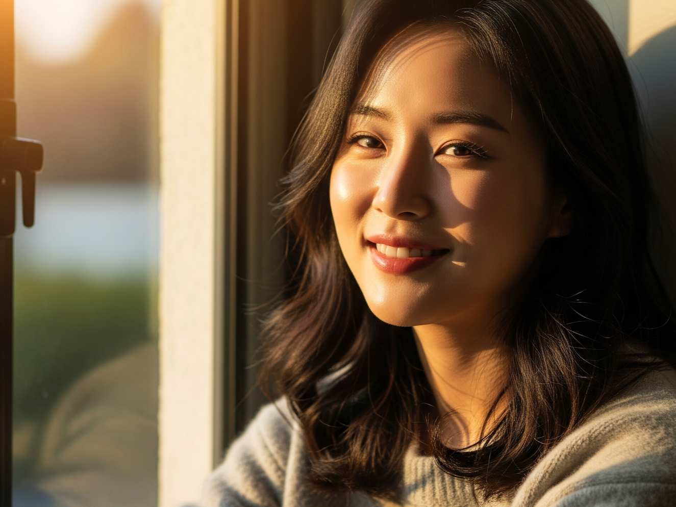 "창가에서 햇살을 받으며 미소 짓는 한국 여성"