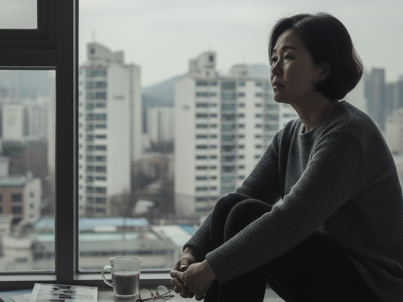 창밖을 보며 무기력하게 앉아 있는 중년 여성