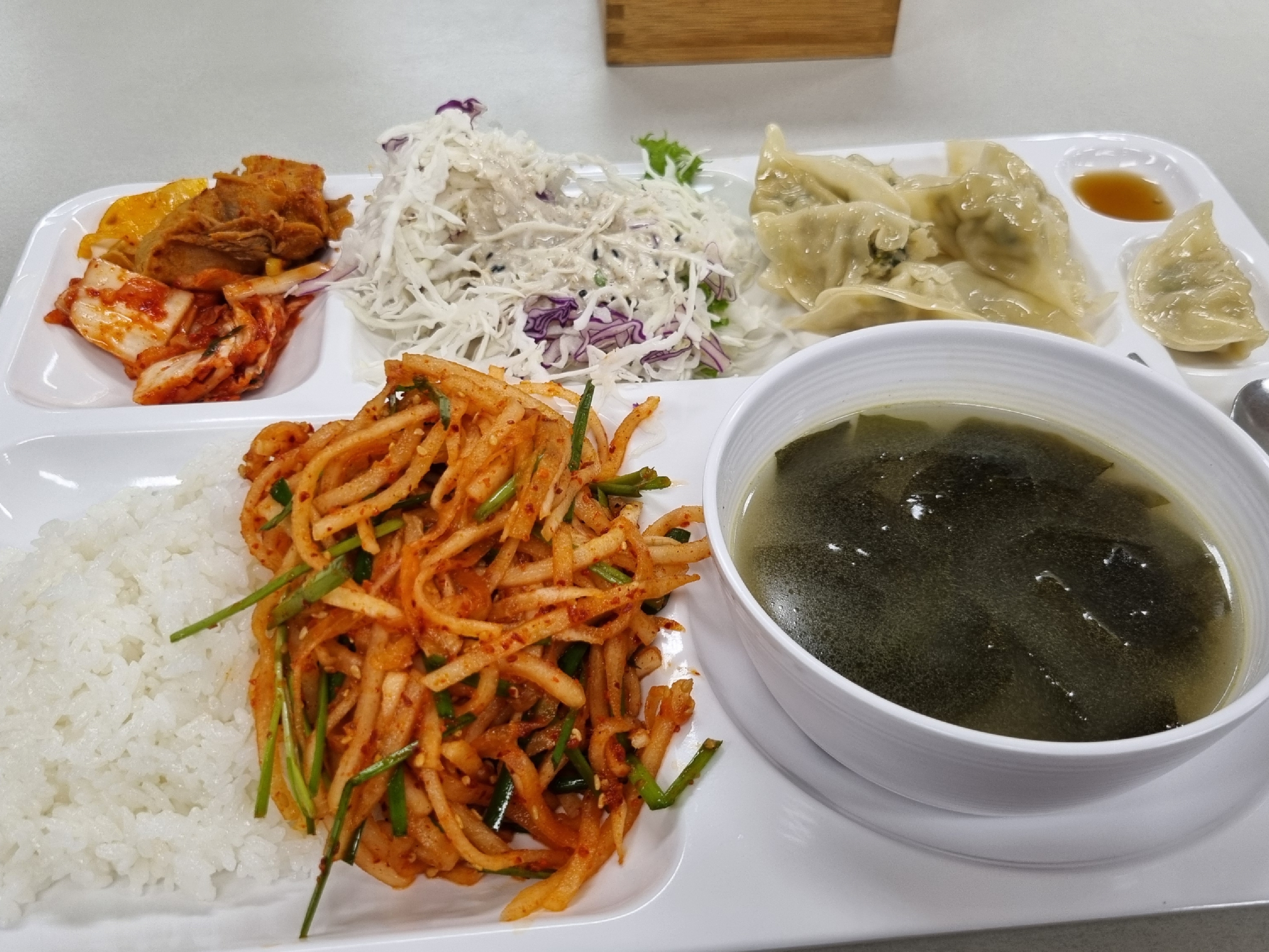 밥 1/3 공기, 무생채, 만두 몇 개,
