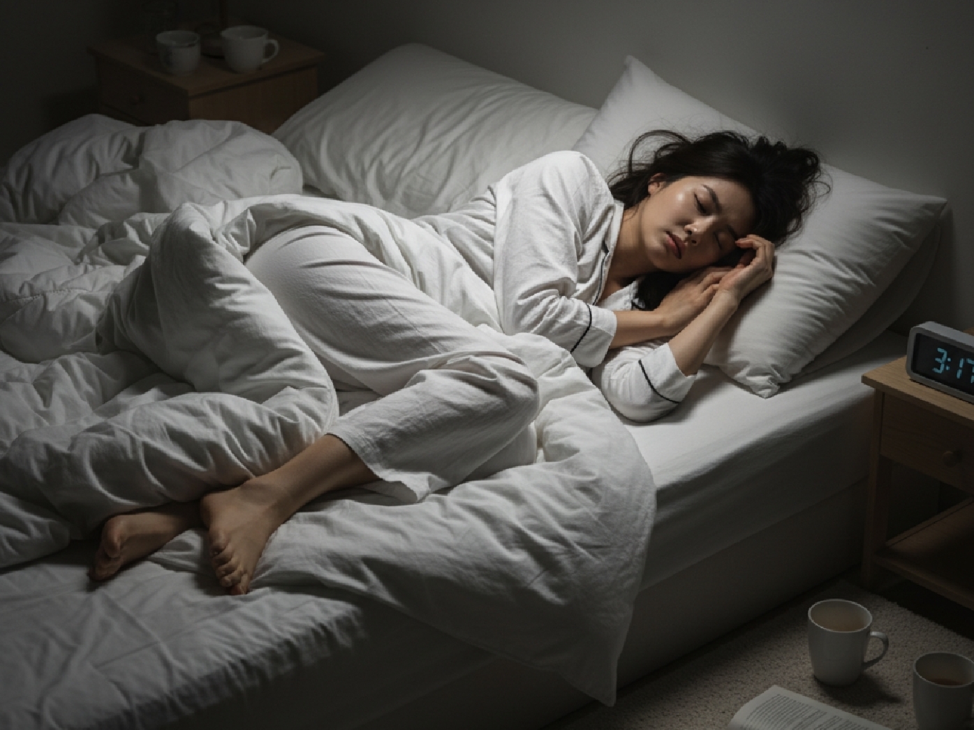 잠이 오지 않아 잠자리에서 뒤척이는 모습