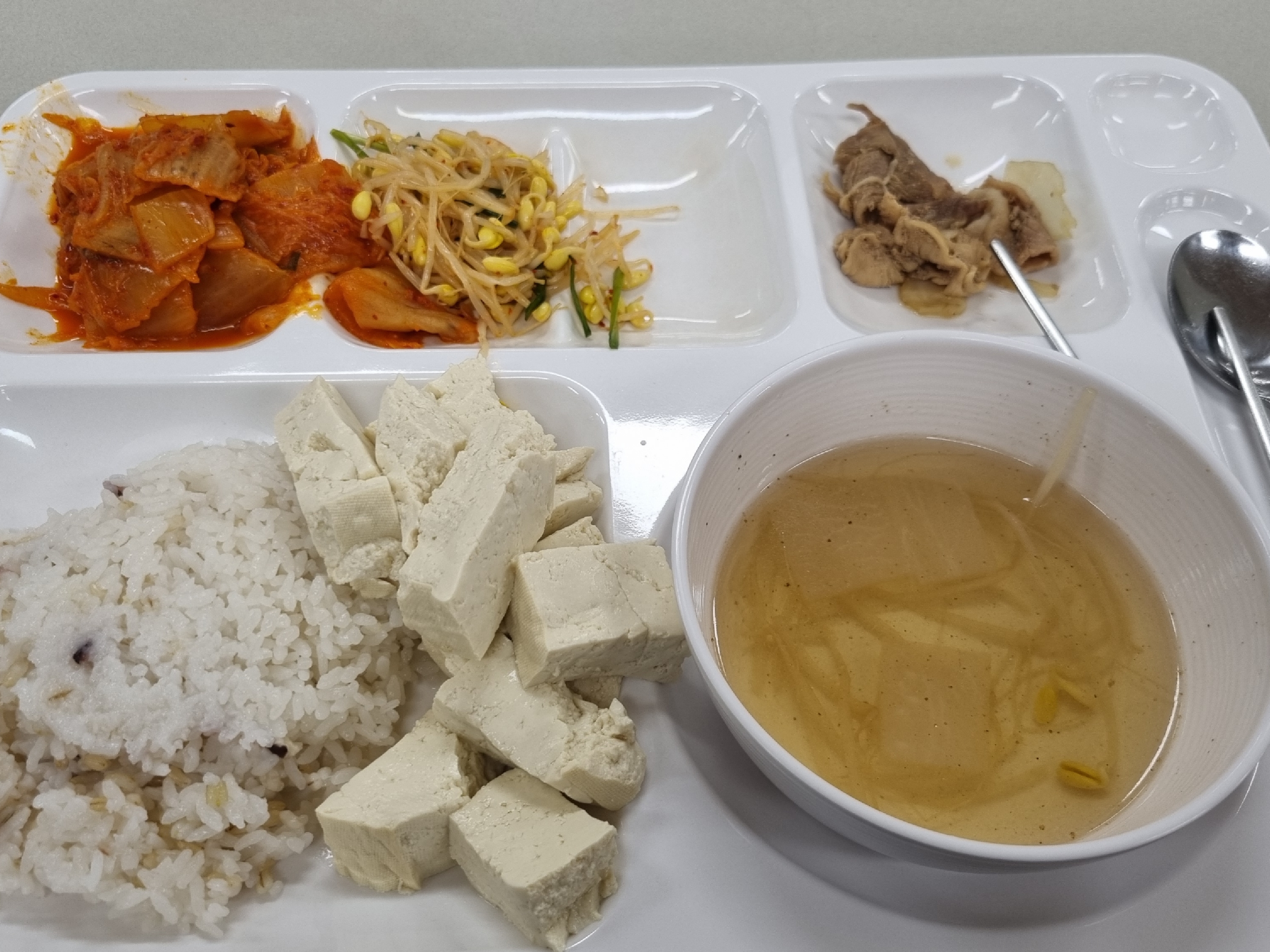 회사 점심 메뉴 내가 선택한 두부 김치볶음 콩나물국 콩나물무침 그리고 돼지고기 볶음