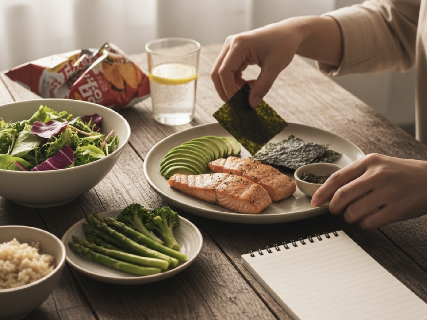 - 현장 적용 (어제 메뉴): 마늘종과 멸치볶음은 양념이 진할 수 있었으나, 다행히 간이 싱거워 허용 범위 내에서 섭취했다. 특히 김은 조미김이 아닌, 얇은 김에 기름만 바른 소금이 거의 없는 상태라 안심하고 밥과 곁들였다. 가공이 적은 김은 훌륭한 섬유질 공급원이 된다.