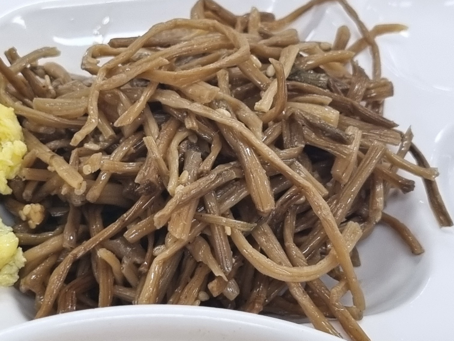 자리에 앉아 첫 입으로 집은 건 고사리무침이라고 착각했던 고구마순 무침. 입안에 넣자마자 ‘아, 이건 고사리가 아니구나’ 싶었다. 부드러울 줄 알았는데 질기고 오래 씹어야 하는 식감. 하지만 샐러드가 없는 날엔 이 질긴 식이섬유라도 고맙다. 천천히 씹으며 “이 정도 질기면 식후 혈당은 조금은 버텨주겠지” 하고 스스로에게 말해본다.