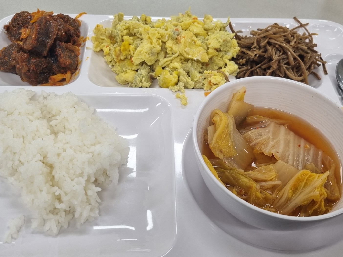 메인 반찬은 배추 듬뿍 들어간 김치국, 철판 위에 수북하게 쌓인 달걀스크램블, 그리고 고구마순 무침. 그런데 내가 제일 먼저 찾는 샐러드 코너가 텅 비어 있었다. 잠깐 멈칫했지만 이내 체념했다. 선택지가 적을수록 전략은 더 뚜렷해진다. “있는 것 중에서 제일 나은 걸 고른다.” 그게 오늘의 기준이었다.
