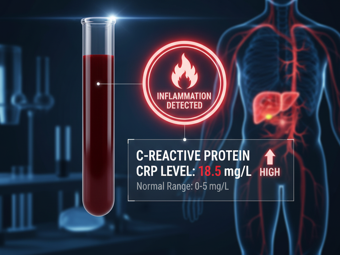 CRP는 우리 몸의 간에서 만들어지는 특별한 단백질이에요. 평소에는 조용히 있다가, 몸 어딘가에 '염증(불)'이 생기면 혈액 속으로 급격히 늘어나서 “여기에 문제가 있어요!” 하고 알려주는 경보등 역할을 한답니다.